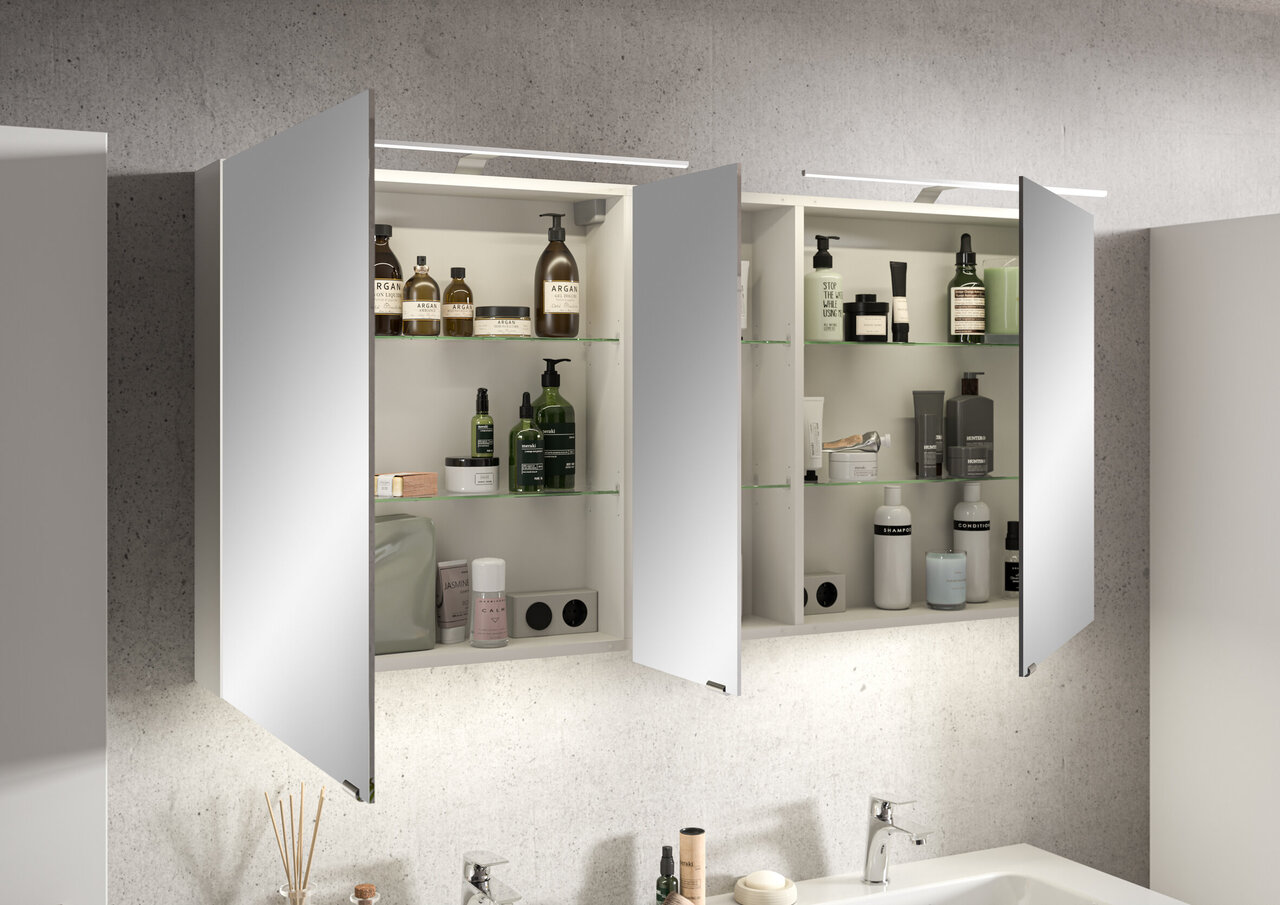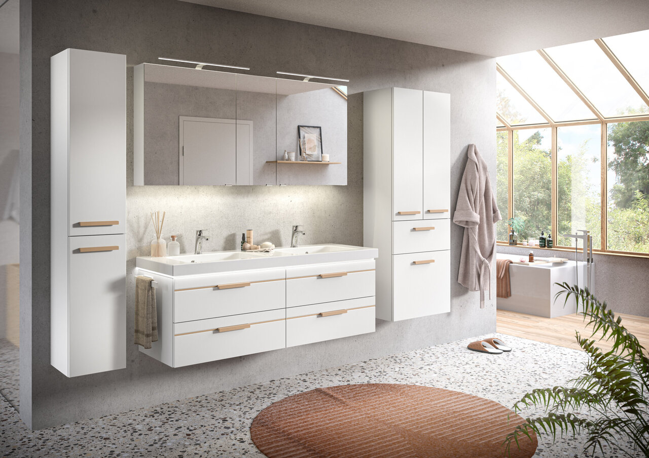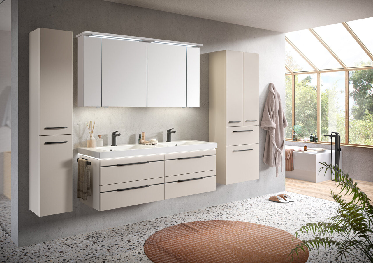 A bathroom furniture collection that impresses with its enormous diversity of designs. The stylish front panels of the washbasin vanity units in a new glass design or with softened edges and a high-quality chrome finish make your bathroom a very trendy highlight. Atmospheric, elegant lighting and light effects in the furniture and the classy mineral marble washbasins give your bathroom surroundings an added touch of style. The carefully selected colours and décors bewitch those who see them, awaken a passion within and create a desire for more. The range of products has been finalised, meaning you can choose your bathroom furniture right now. Let’s go!