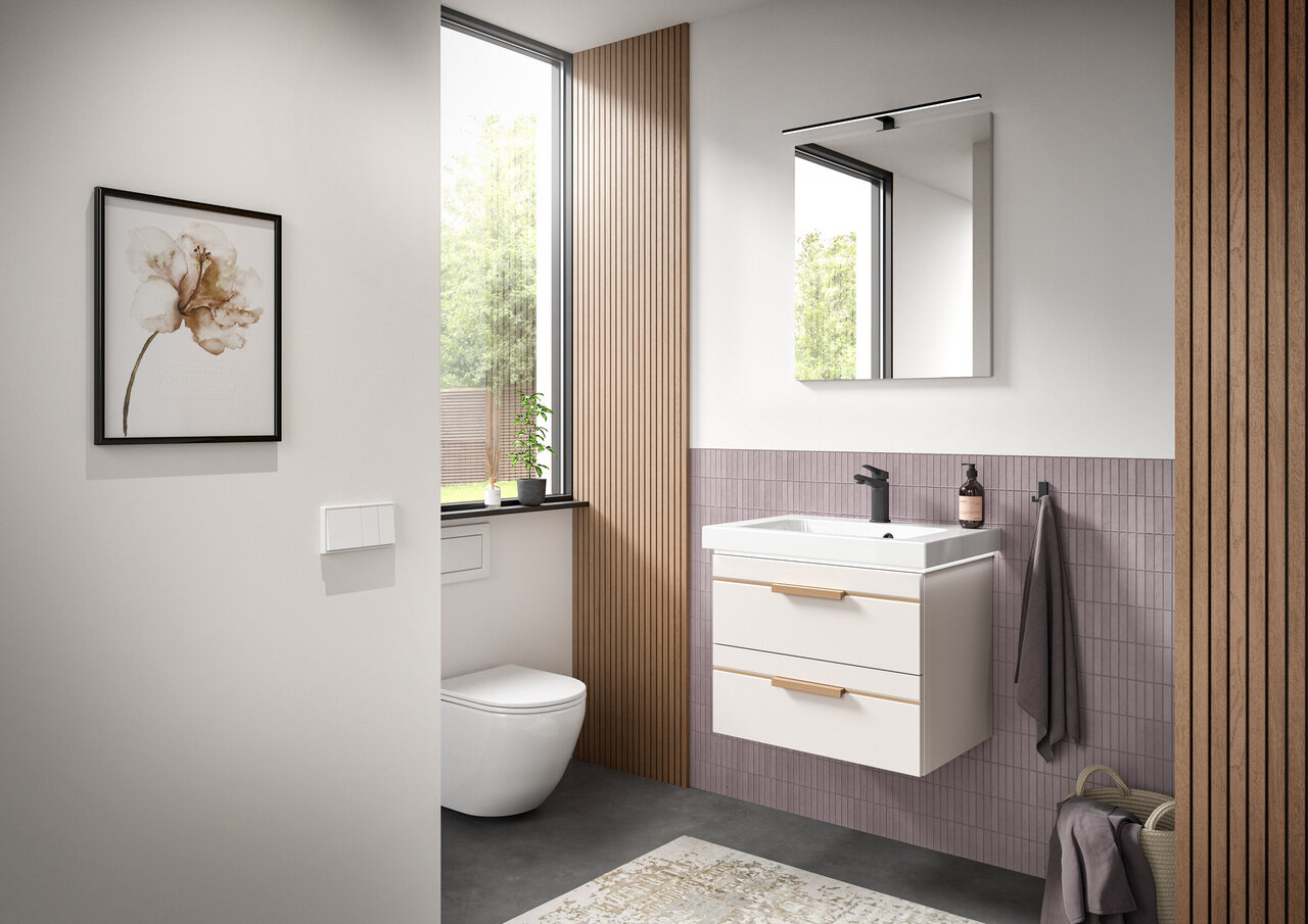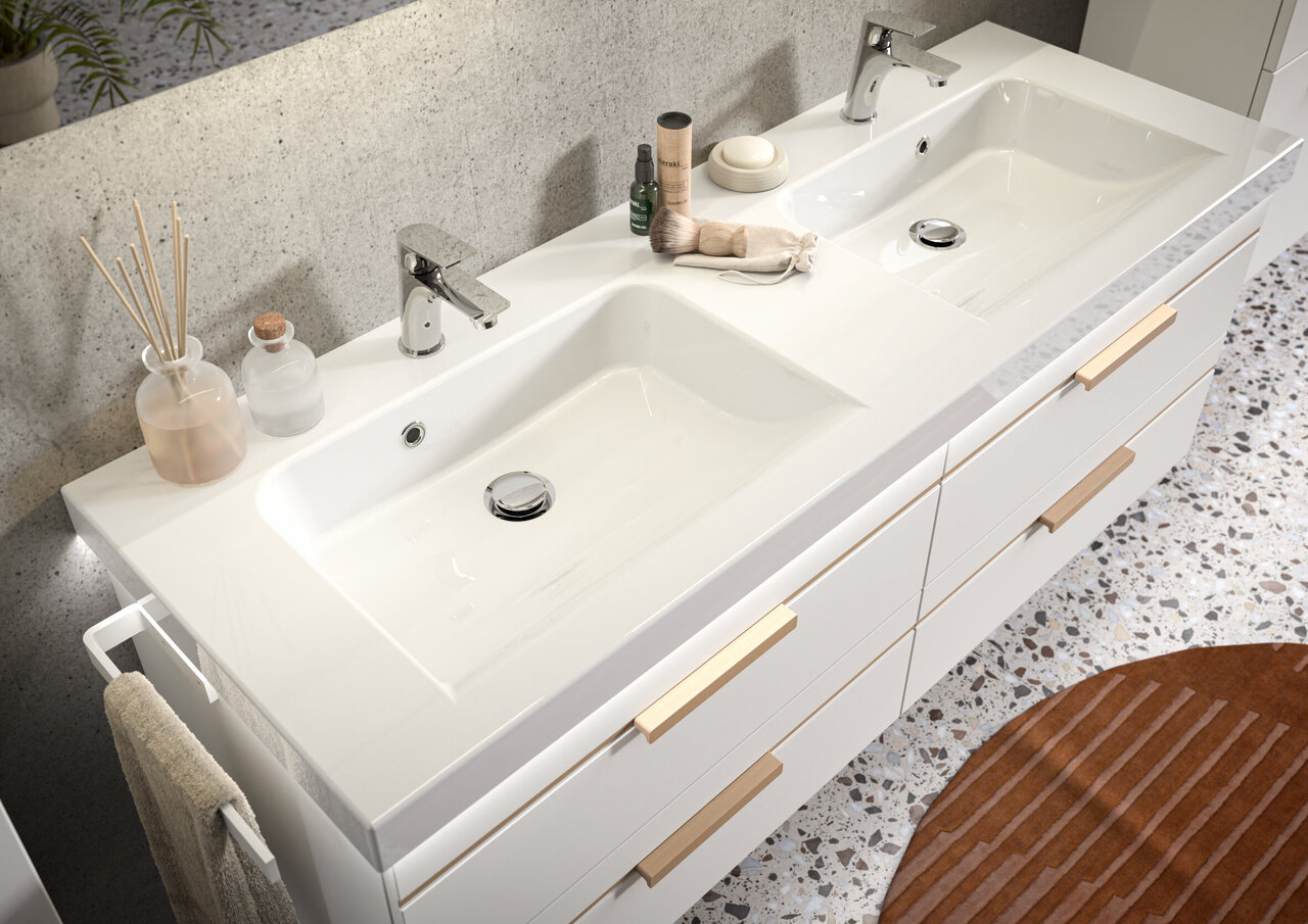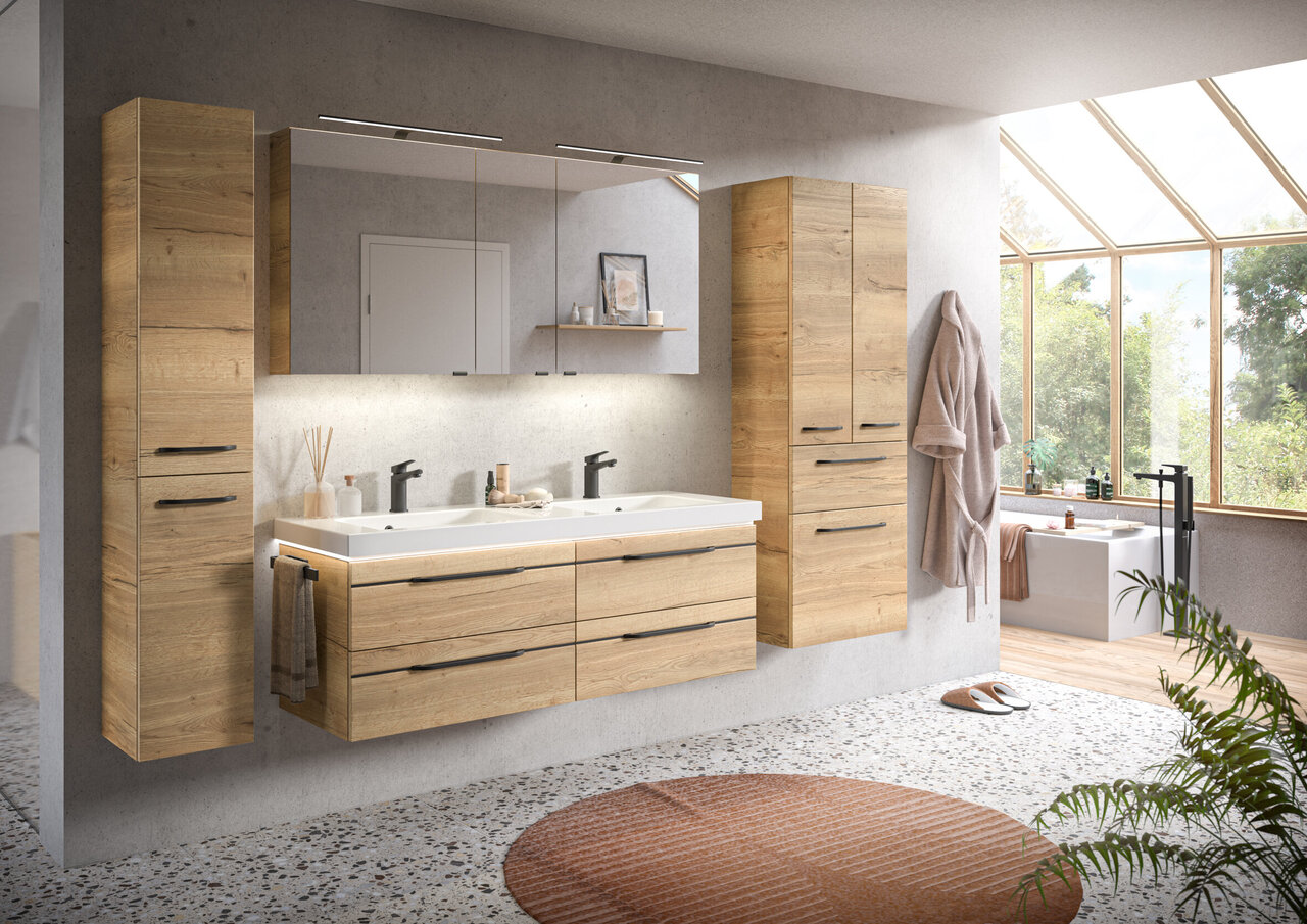 A bathroom furniture collection that impresses with its enormous diversity of designs. The stylish front panels of the washbasin vanity units in a new glass design or with softened edges and a high-quality chrome finish make your bathroom a very trendy highlight. Atmospheric, elegant lighting and light effects in the furniture and the classy mineral marble washbasins give your bathroom surroundings an added touch of style. The carefully selected colours and décors bewitch those who see them, awaken a passion within and create a desire for more. The range of products has been finalised, meaning you can choose your bathroom furniture right now. Let’s go!