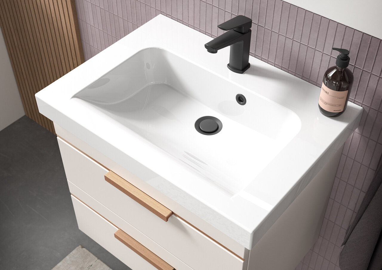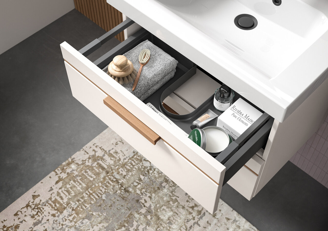 Our furniture is fitted with high-quality glass shelves. The washbasin vanity units are fitted with a shelf in carcass colour.
