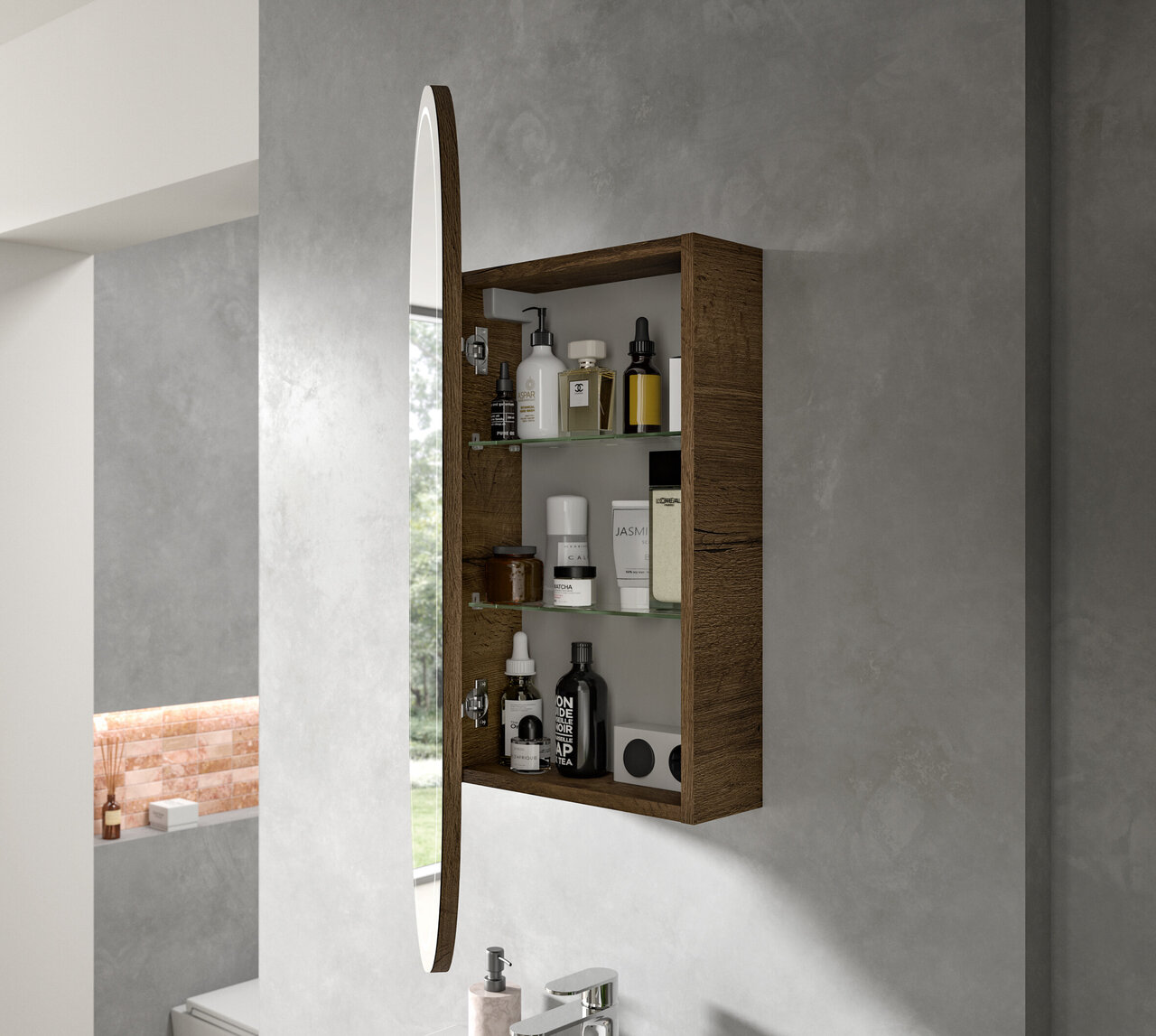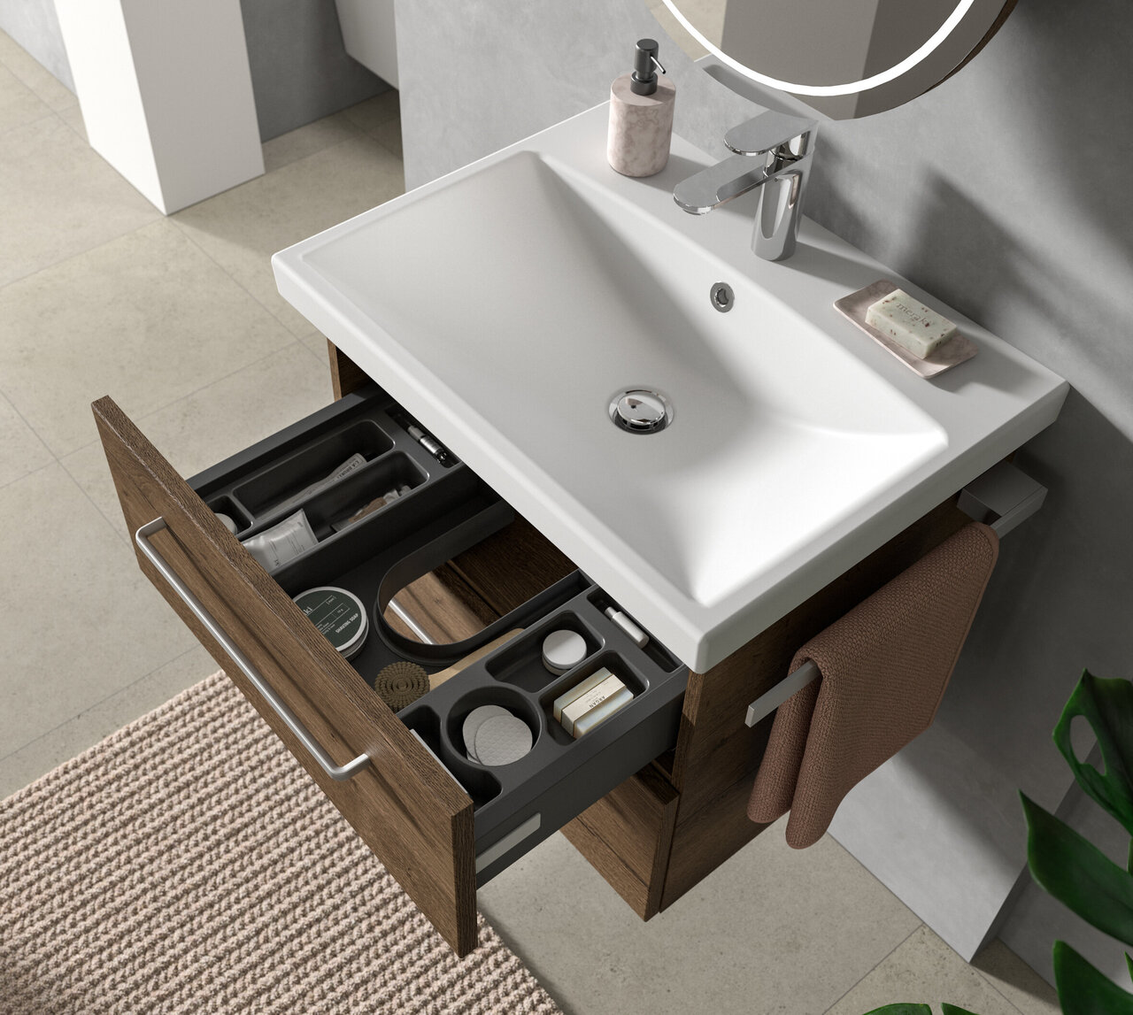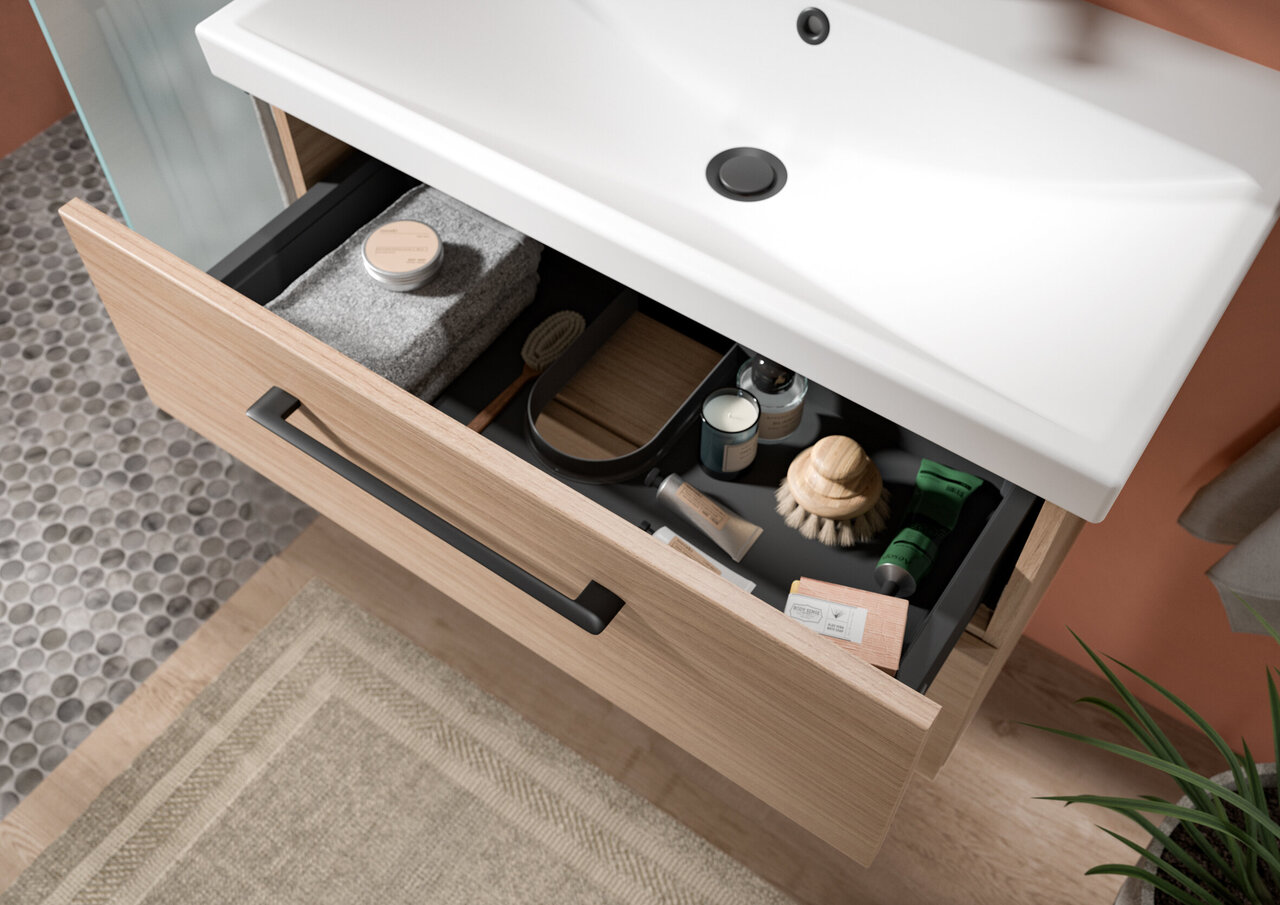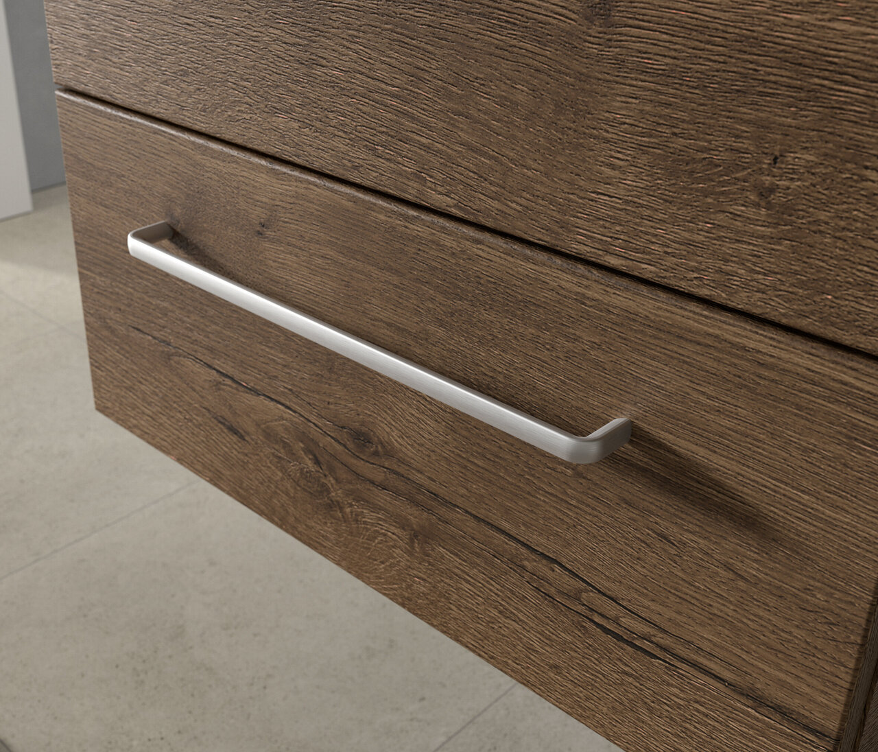 Our furniture is fitted with high-quality glass shelves. The washbasin vanity units are fitted with a shelf in carcass colour.