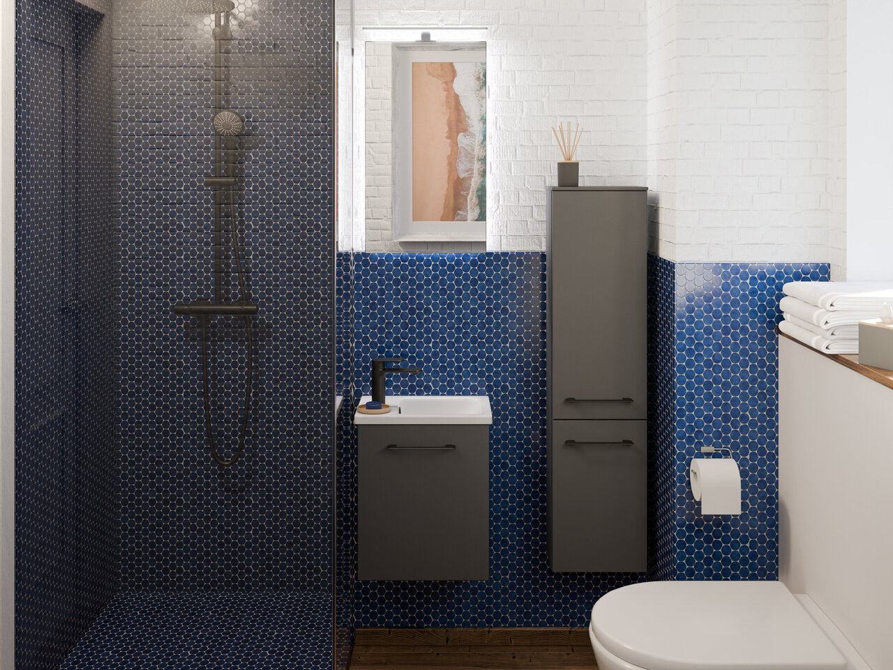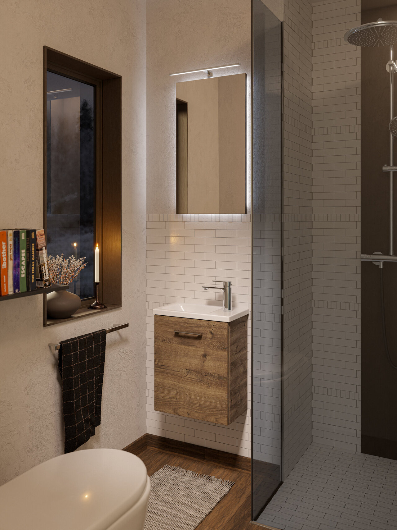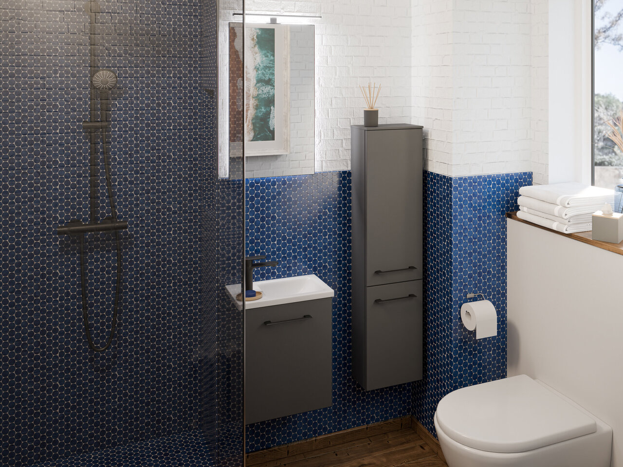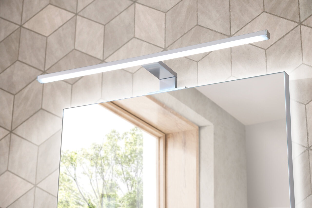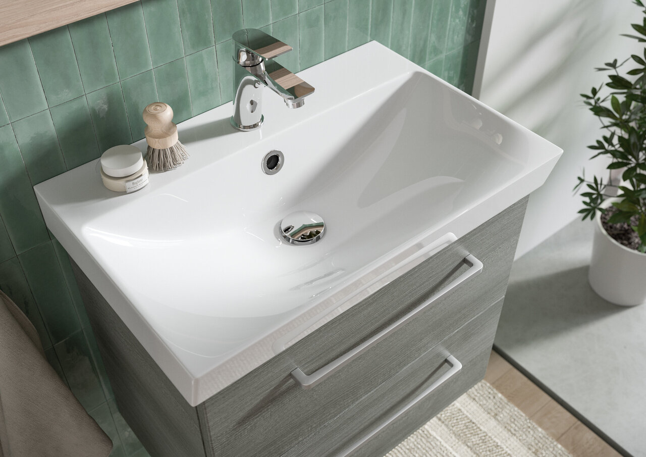 Our furniture is fitted with high-quality glass shelves. The washbasin vanity units are fitted with a shelf in carcass colour.