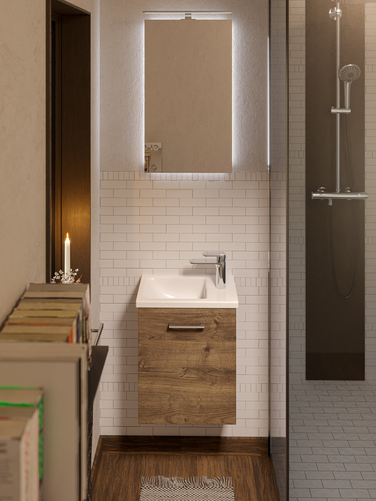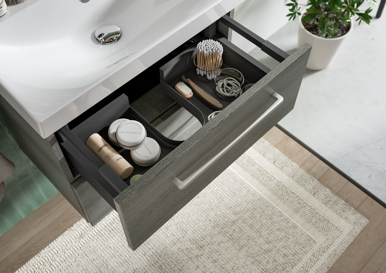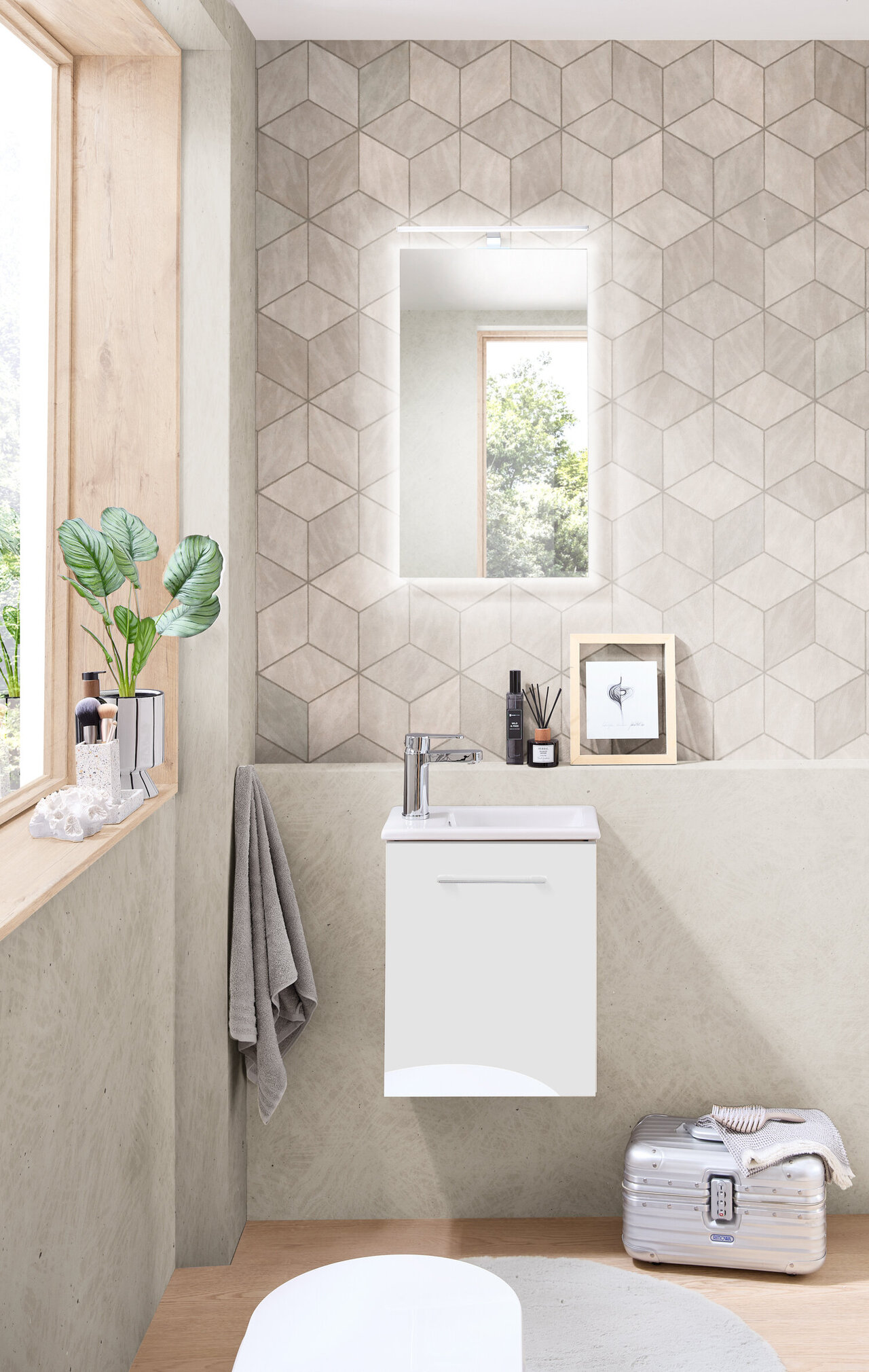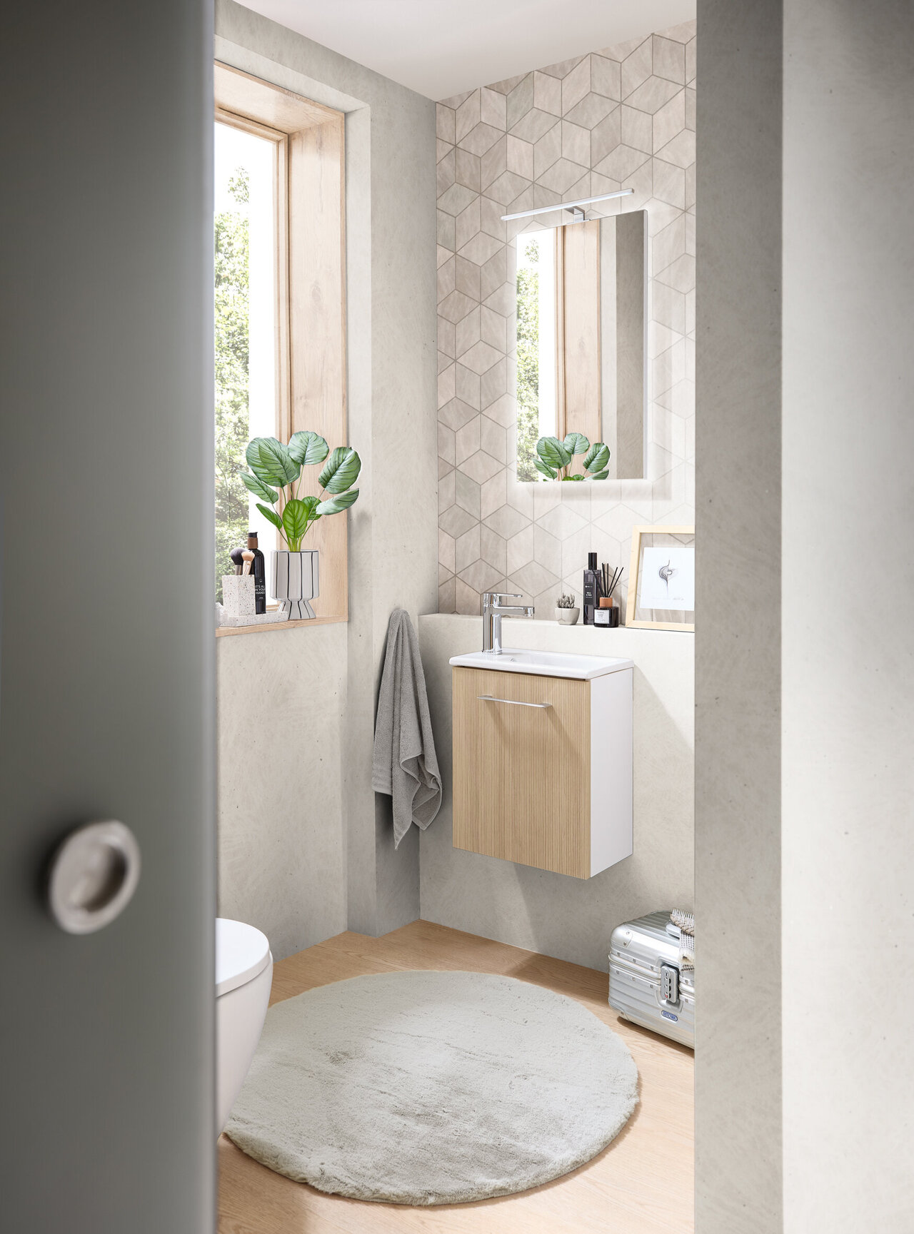 Pelipal would like to present its new space-saving wonder, the SERIE 6910. With washing areas in various sizes, there is a modern, intelligent solution to suit any space. In particular, the models with a reduced depth offer new design possibilities, which are even in high demand in the usually confined spaces of old bathrooms. The linear design has an elegant look and can be paired with a wide range of front panel and carcass décors to suit one’s own design preferences, from classic white, through warm Ribbeck oak, to the extravagant Oxide Ferro. High-quality washbasins made of mineral marble, ceramic or Krion add the finishing touches to the ensemble.
